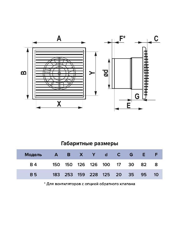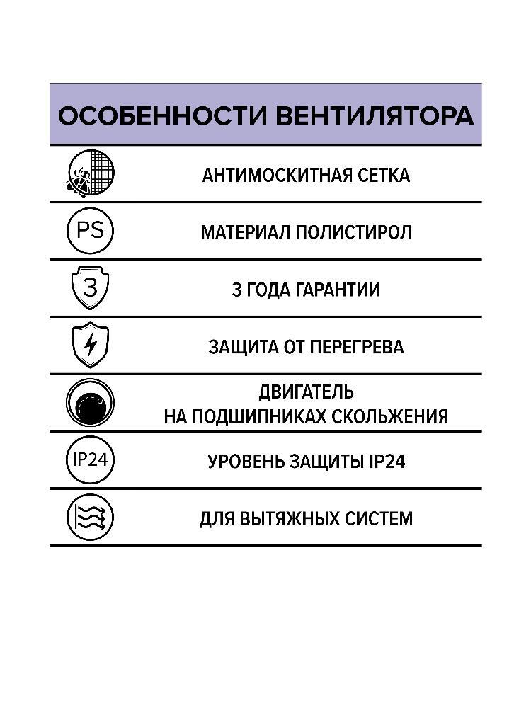 Разъемная конструкция лицевой панели упрощает очистку вентилятора от загрязнений. Антимоскитная сетка устанавливается во всех моделях. Уровень защиты – IP24.